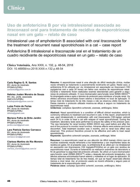 - > Uso de anfotericina B por via intralesional associada ao itraconazol oral para tratamento de recidiva de esporotricose nasal em um gato - relato de caso